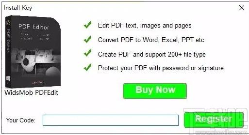 运行PDFEdit,单击“激活”,在弹出窗口中填写许可证密钥,然后单击绿色框中的“注册”按钮将其激活。成功激活程序后,可以删除时间限制和评估标记。
